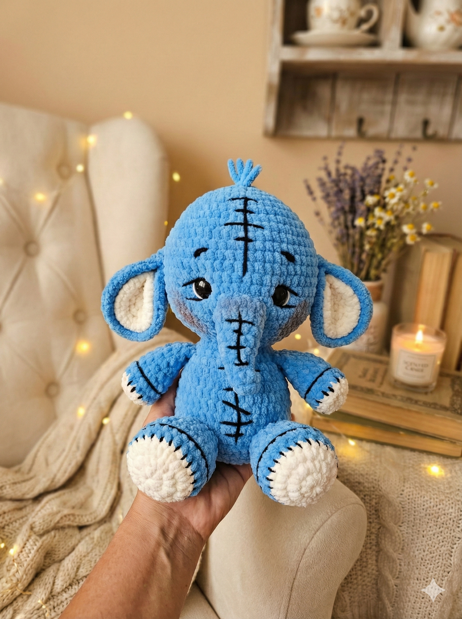 Você receberá um passo a passo escrito, com instruções claras para confecção do corpo, tromba e orelhas, além de dicas para trabalhar com fio chenille e obter acabamento redondinho e profissional.