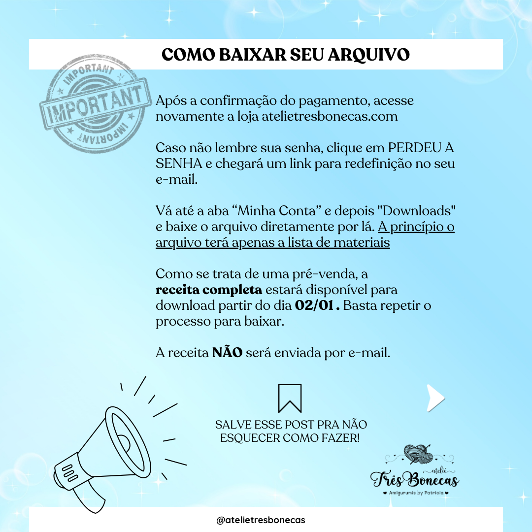 Esta é a receita digital em PDF, ideal para quem deseja ampliar o portfólio e criar uma peça moderna, vendável e super abraçável.